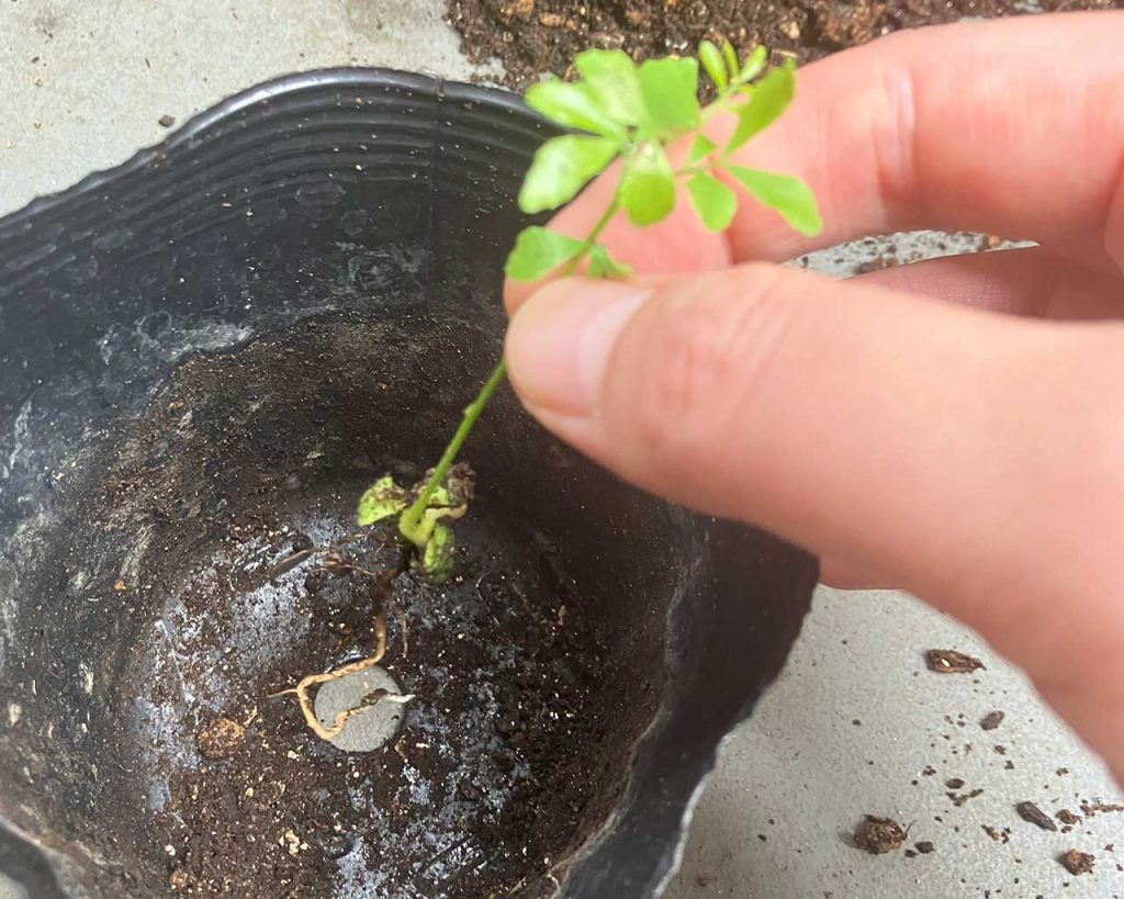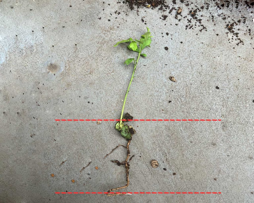 地下と地上に出ている部分の割合が1:1.5くらいでしょうか。根っこの先端が白くなっていますが、そこはポットからはみ出していた部分となります。種まきをして1か月半~2か月くらいですが、結構成長しているものですね。