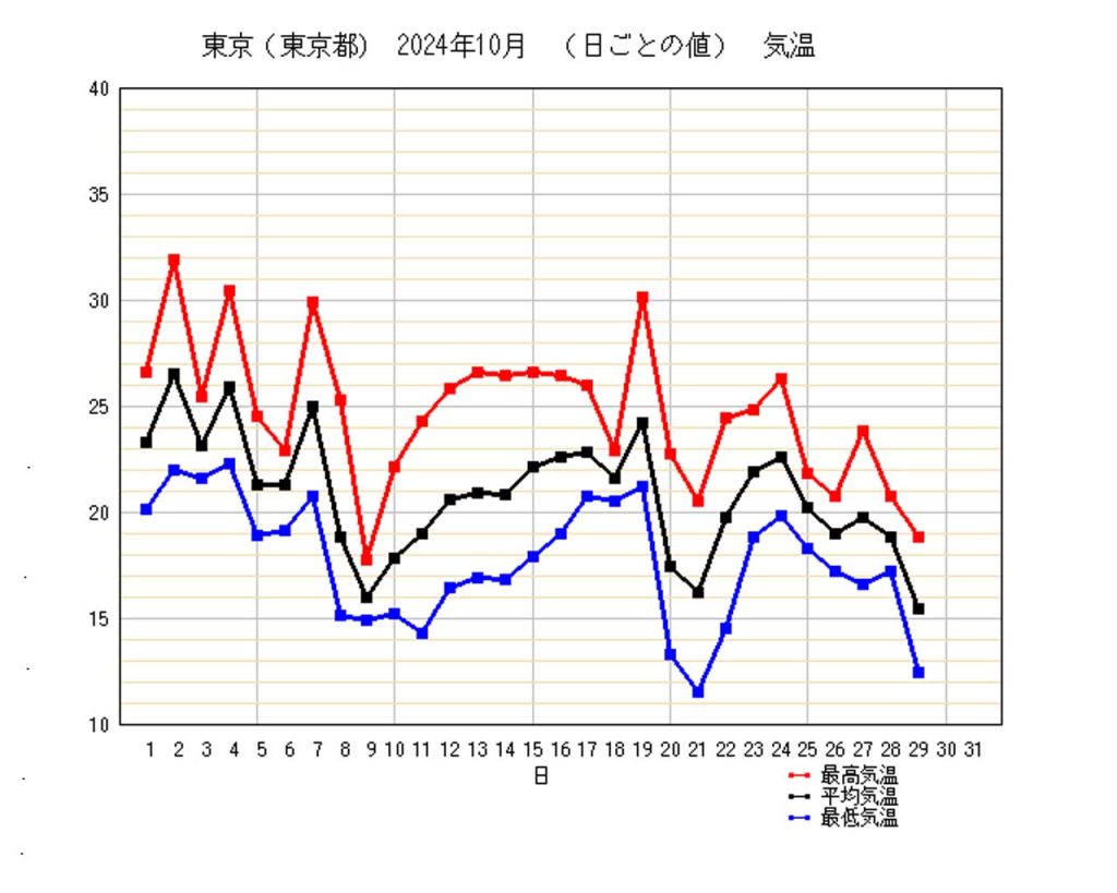 気象庁のHPより気温の推移を確認したところ、10月は徐々に右肩下がりで低下しております。今日の最低気温が12℃でグラフの青色の線が一段と下がっております。グラフの集計が29日までとなりますが、9日、21日、29日の平均気温が一段と下がっており、29日の平均気温は15℃台となっております。