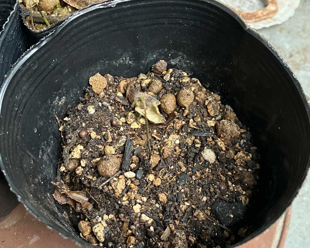 補足しますと、カレーリーフは種によって2つ新芽を出す場合あります。その際間引きして引き抜いた芽を植え替えておりました。その結果がこのようになりました。同じ条件でまだ元気な株もありますので、植え方が悪かったのかもしれません。ですが、このパターンの場合は室内管理の方がいいかもしれませんね。