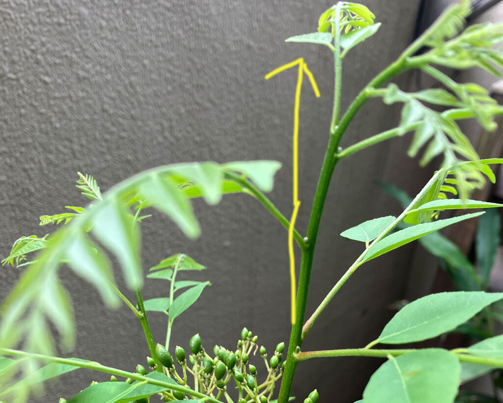 カレーリーフは種を付けたら、そのあとは横からまた新しい枝を出してグングン上に向かって伸びていきます。