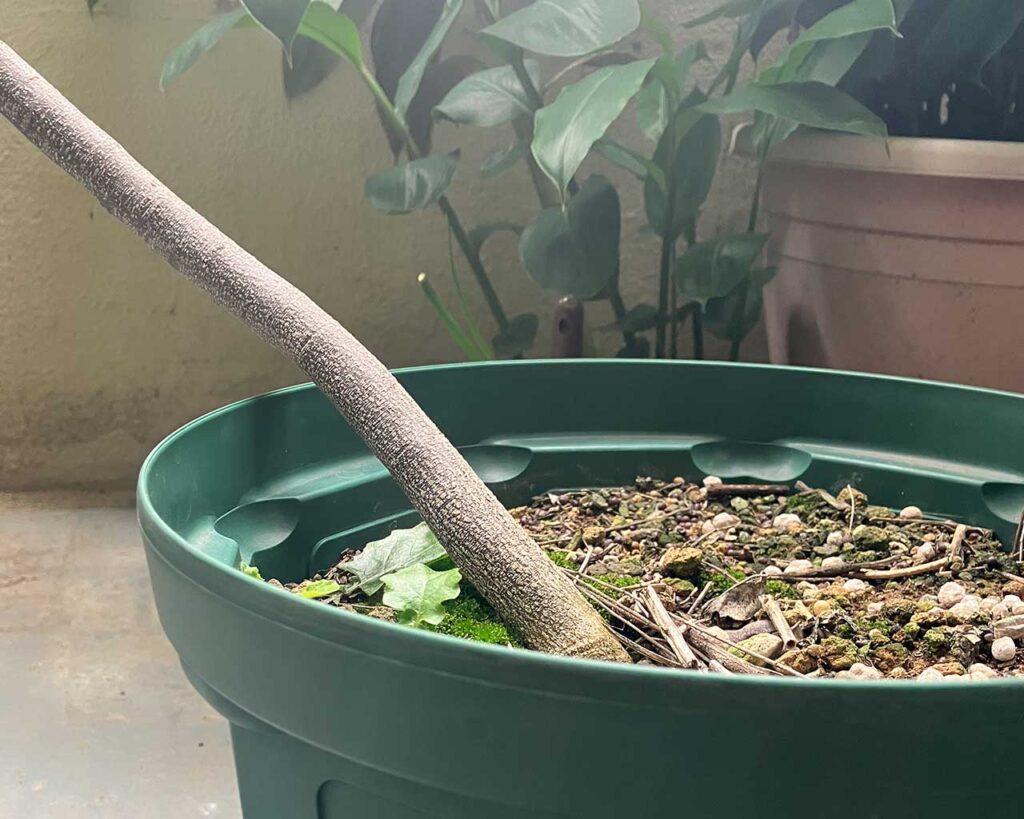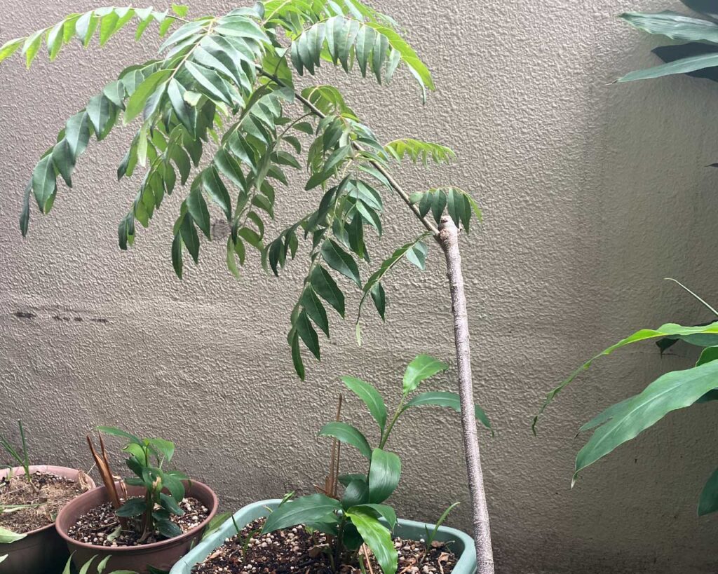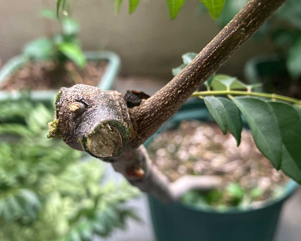 カレーリーフの新株を落としました。ついでに新芽の様子を観察してみましょう。