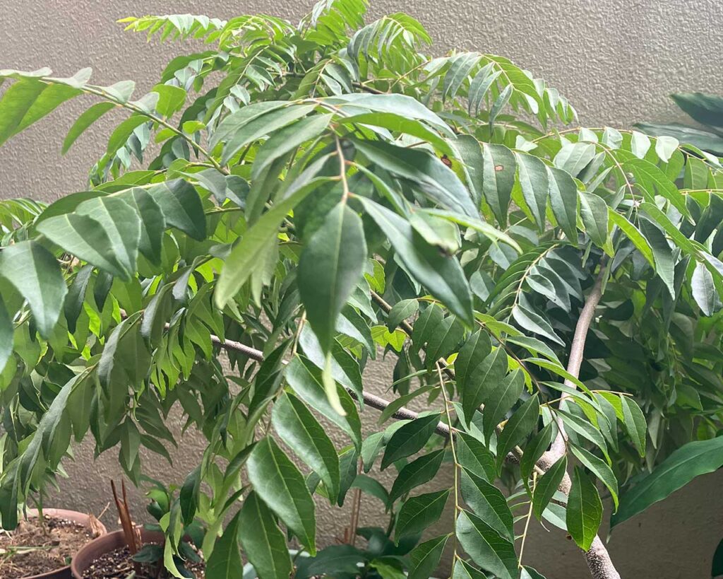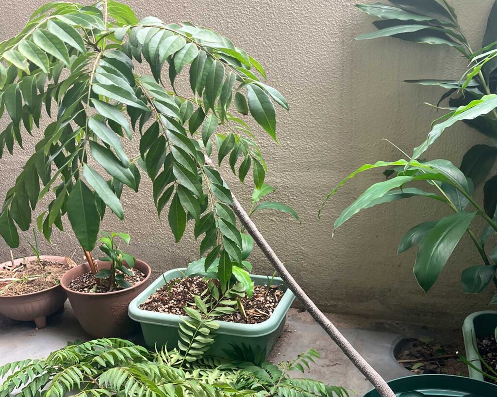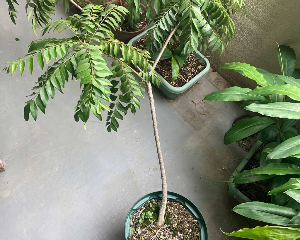 3~4年目の株です。今年もたくさんの種をつけてくれたカレーリーフの木ですが、下の写真のように斜めというか、ほぼ真横になってしまいました。