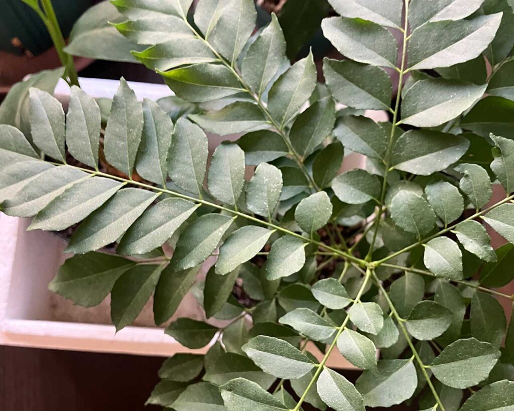 私の環境ではカレーリーフをおける場所が西向きの窓の部屋となり、午後でも直射日光が入るのはおおよそ3時間程度の環境です。室温は、晴れた日の窓際で25℃近くまで上昇しており、夜は、20℃を下回り18℃台になっております。寝ているときはさらに下がっているかもしれません。