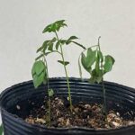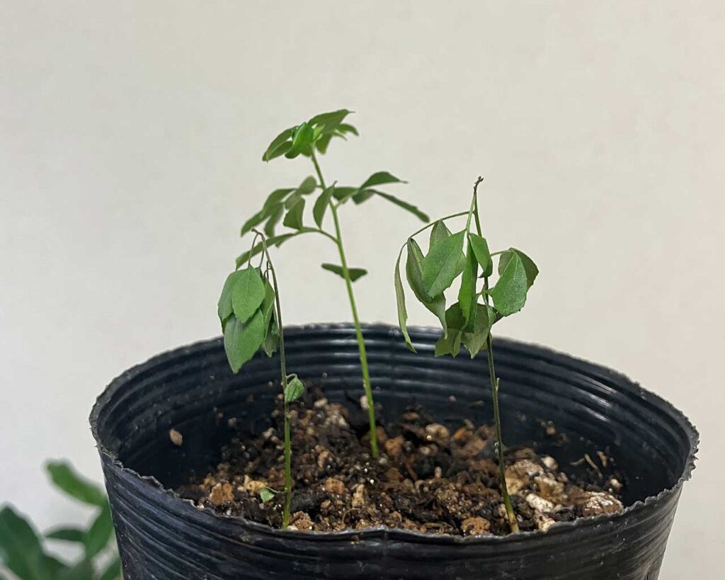 下の写真は11/4に間引きをして引っこ抜いた新芽を植え替えてみたものです。こちら非常に元気がありません。中央の1本は何とか乗り越えて欲しいです。寒くなってから植え替えてたのが悪かったので、室内でも厳しいのでしょうか。やはりカレーリーフの1年目の株はヒョロヒョロでとても繊細です。